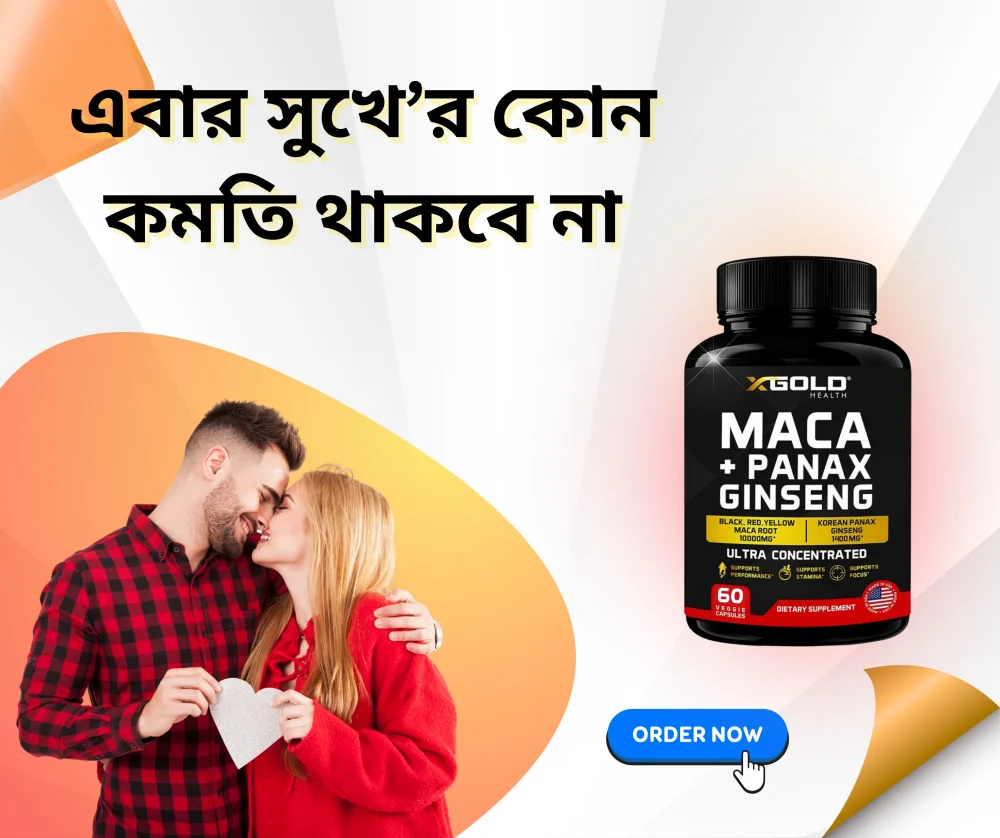 এটি XGold Health America 🇺🇸 এর একটি পন্য যা সম্পুর্ণ আয়ুর্বেদিক ফর্মুলায় তৈরি। এটি তৈরিতে বিশেষ যে উপাদান ব্যবহার করা হয়েছে তা হলো, Maca রুট এবং কোরিয়ান প্যানাক্স জিনসেং।